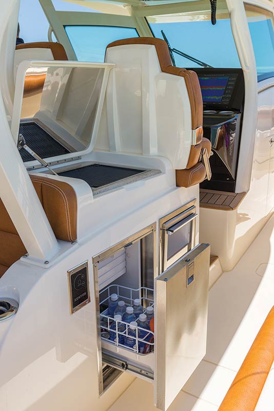 Innovations abound aboard the hard-topped center console boat, starting with an optional hydraulic portside beach platform equipped with a stowable four-step pocket ladder. The new door is intended to give swimmers and divers a safer and more easily accessible boarding area than the traditional transom, especially when confronted with four engines. “The boat incorporates the new technology along with the high-end luxury touches,” explained Lawton, whose expertise with the 420 LXF extends into designing the electrical, fuel and plumbing systems. “You have the higher end upholstery with custom 420 LXF stitching in key places.”