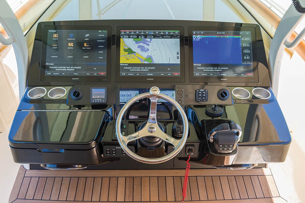 At the helm you’ll find a center-mounted steering wheel with Yamaha shifters and throttles on the right. The high-tech dash features three Garmin 8215 15-inch screens as standard equipment, though customers can upgrade to 17- or 19-inch touchscreens. “The glass cockpit look is becoming more common, and yacht owners especially are very familiar with it,” Lawton said. “It’s totally customizable and you can put whatever you want on each screen.”
