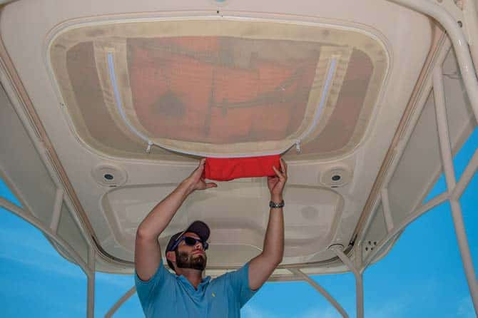 The walk-through tempered-glass windshield and composite door protects the driver and companions from spray and wind. The T-top’s shelter keeps folks dry and shielded from the sun, and its overhead zip-in storage holds PFDs or clothing. To port, a wide seat with a small storage pocket holds devices such as iPads, smartphones and controls for the stereo, and there is also a door that leads to the large head compartment with extensive storage space.