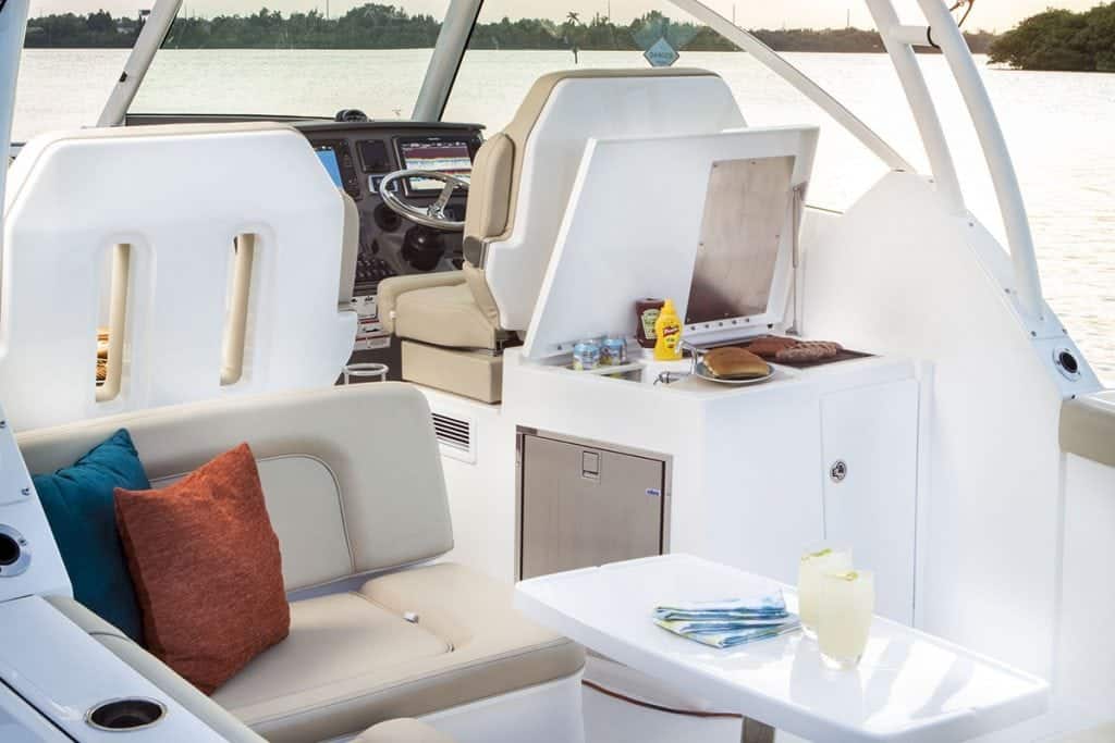 A doublewide seat is at the helm, guest seating in the cockpit and wraparound seating in the open bow. The cockpit features a Bluetooth-compatible speaker system, as well as an entertainment center with a hot/cold sink and optional electric grill. Coolers can be found beneath the aft-facing seats. Below and starboard is the head, with a lounge area and additional equipment storage to port. Powering the DC 325 are twin Yamaha 300s. Several electronics options for Raymarine navigation and equipment are available.