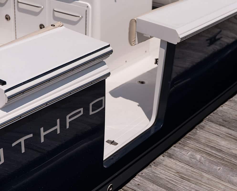 The exclusive Hunt 4 Design® allows for easy moving on deck. The deep-V hull has a 22-degree transom deadrise, a reverse transom with tumble aft and a Carolina-style bow. Safety features include primary and secondary bilge pumps with high water alarm, non-skid fiberglass deck and liner, bolted 316 stainless steel grab rails, transom door with heavy-duty latch, and emergency boarding steps. Conveniences include a solid-surface countertop with stainless steel sink, a pullout freshwater showerhead with sump pump, and a freshwater head. Additionally, there is a USB stereo input, Fusion® stereo system with Bluetooth capabilities and two accessory 12V outlets.