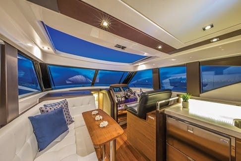 This island establishes two ways of egress, a definite advantage for singlehanded docking or boarding regardless of the marina’s finger pier configuration. The dual entry is also a winner with grill masters as they rush a plate of hot hamburgers or mouthwatering mahi-mahi from the innovation award-winning Kenyon All Seasons Electric Grill recessed in the aft island. This eliminates a congestion point yet keeps everyone close to the conversation.