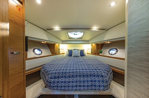 Other notable design features include a manual sunroof and Duette blinds for port and starboard salon windows. The Fusion 3 zone sound system—with wired remote powered by JL Audio digital amp—blasts your favorite tunes from four speakers and Polk 8″ subwoofer with tuned enclosure. Bring your own playlist on board, as the unit accepts USB/MP3 and has integrated Bluetooth.