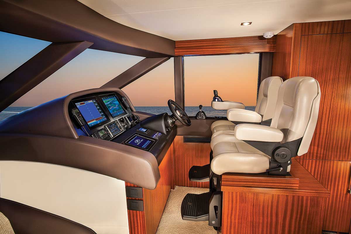 Electrically heated floors provide an even heat throughout the vessel, and the premium ventilation system keeps the boat smelling fresh and clean and also helps to keep mold and mildew at bay. A pop-up big screen TV with Bose sound system ensures great entertainment. The three-receiver satellite TV antenna allows different channels to be watched in each stateroom. The helm station is forward and to starboard and equipped with two individual Stidd helm seats. The skipper’s chair features a joystick control on the armrest that falls easily and naturally to hand. There are also dash-mounted holders for an iPad or iPhone, either of which can control most of the systems on the boat, yet all of the Concord 65’s sophisticated electronic and electrical systems can also be operated manually.