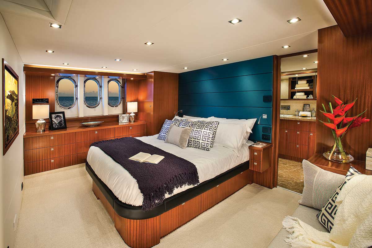 Access to the vessel is over the integrated swim step and then up port or starboard curved stairs to the aft deck. From the swim step one can also enter, through a transom door, one of the best designed and laid out engine room spaces in any boat on the water. A watertight bulkhead door offers access to the full-beam master; the ensuite flaunts marble floors, walls and ceilings, and the in-floor radiant heating keeps toes toasty when cruising northern climes to enjoy fall colors. EnOcean lighting controls enable owners to set the mood. Two additional guest cabins belowdecks are standard as is an open laundry area with plenty of stowage. The optional layout includes a crew cabin.