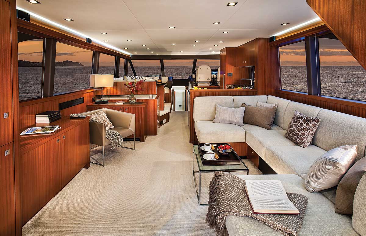 The Concord 65’s sophisticated deckhouse interior is inviting, with excellent fit and finish throughout. Plenty of windows ensure an interior bathed in natural light, and the judicious use of wood, carpet, upholstery fabric, and color gives the vessel a visually warm, bright interior even on a dull day. Full 6′ 6″ headroom throughout adds to the feeling of spaciousness.