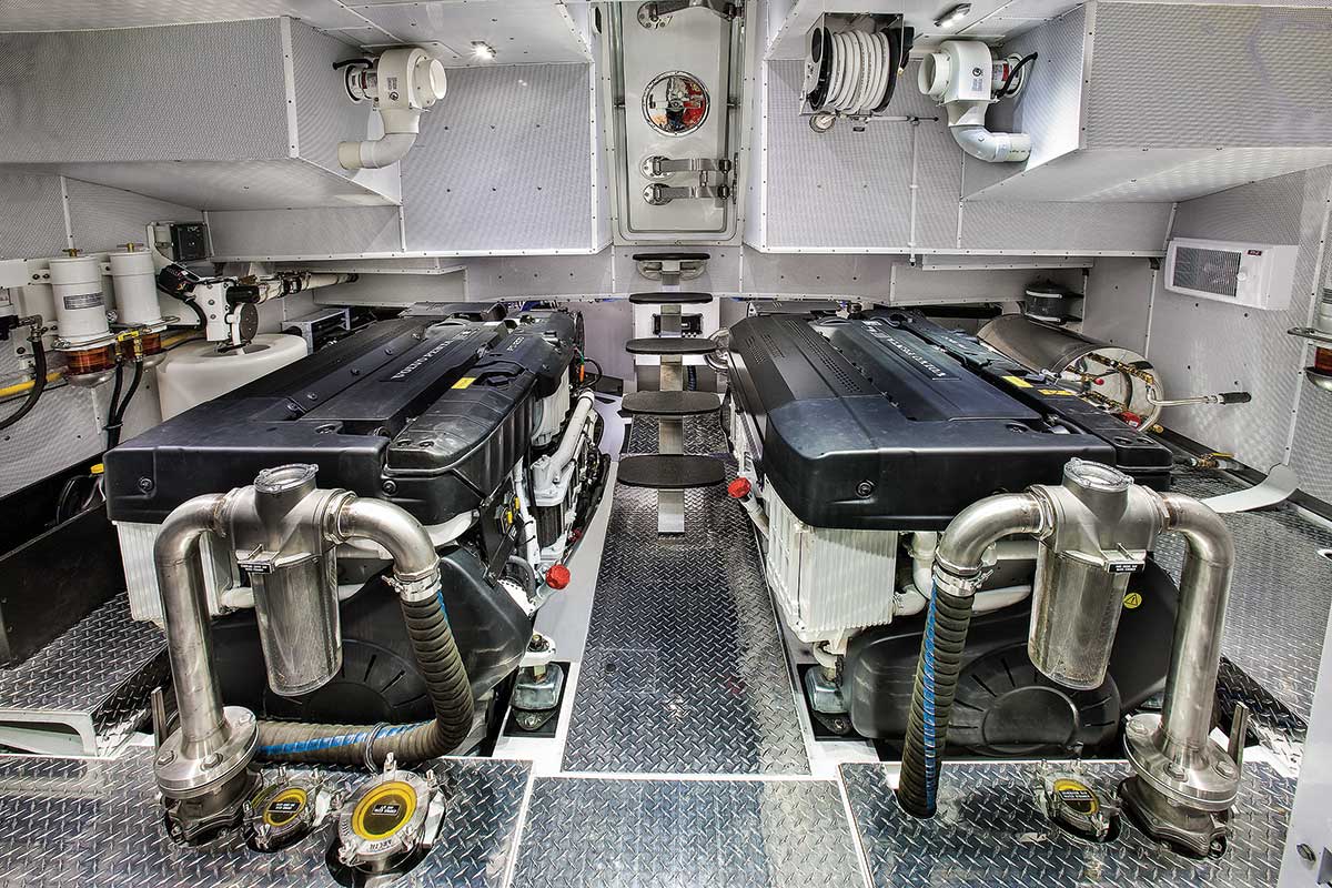 It is seldom that a marine writer gets to compare Hull No.3 with Hull No.1 of a boat line. Sometimes builders simply can’t be consistent from one hull to another even in the same line, but that’s not so with Coastal Craft. I dug out my Hull No.1 data for comparison and noted they have the same engines—a pair of Volvo Penta IPS 12-liter (780 cubic inch) 900-horsepower in-line sixes. From idle speed to wide-open throttle, including several displacement speeds, the rpms, speed and fuel burn of Hull No.3 was identical to the data I gathered on Hull No.1.