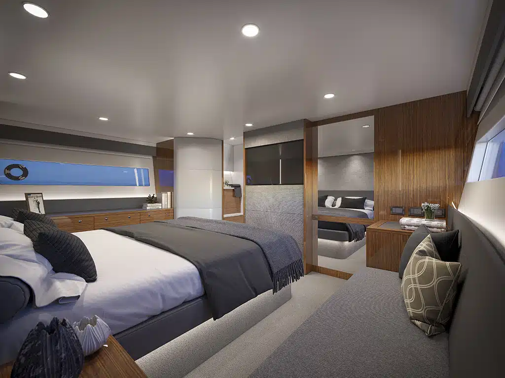 The VIP stateroom forward has an offset queen berth that allows room to walk all the way around it on a flat floor. It’s connected to the day head which is accessible from the companionway. The starboard-side guest cabin is a twin single arrangement, and the full-beam, midship ensuite master stateroom features a centerline king berth.