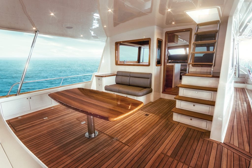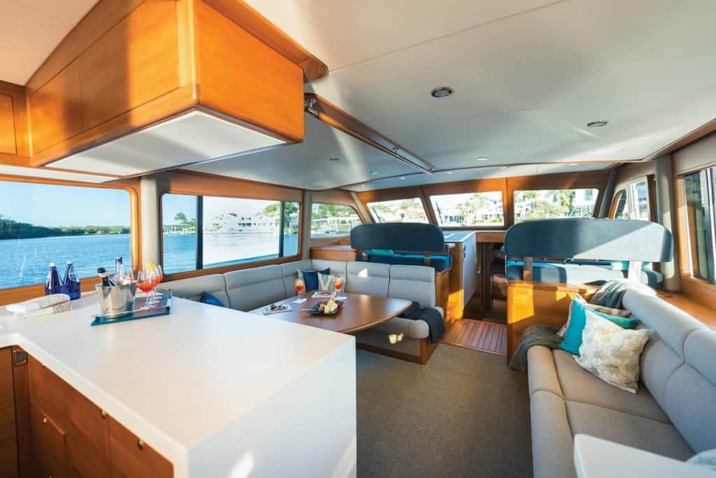 Even before we went out Port Everglades for my sea trial, I was impressed with the customized layout fashioned by the Canadian owners of GB60’s Hull #2. This is the sixth Grand Banks yacht for the experienced couple, who maintain a dock at Hilton Head and live aboard for about six months a year while cruising Florida and The Bahamas. Entering the teak-walled salon from the aft deck up one step and through a bi-fold teak door, to starboard guests find twin facing settees and a glossy wood, adjustable table. The table raises or lowers for dining, drinks, board games, or for a laptop to send email to family and friends.