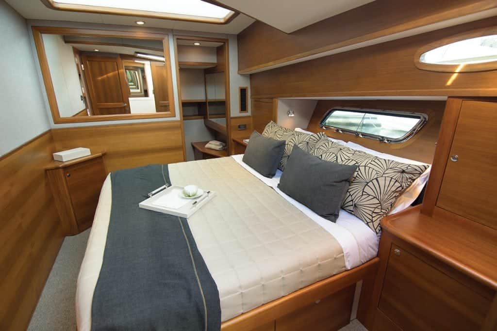 Also, a 42″ flatscreen TV is hidden in the cabinet wall beneath the starboard window. Opposite to port, instead of the standard L-shaped settee with coffee table, the owners opted for his-and-her comfy upholstered chairs, with a cabinet between that serves as a side table with storage. The U-shaped galley forward is well-equipped with a cooktop, convection oven, sink, Silestone countertops, and an overhead cabinet that cleverly lowers with a flip of a switch to conceal galley items. Large windows— dressed with simple but attractive curtains that make the room homey—are all around offering 360-degree visibility at the helm across from the galley forward of the settee.