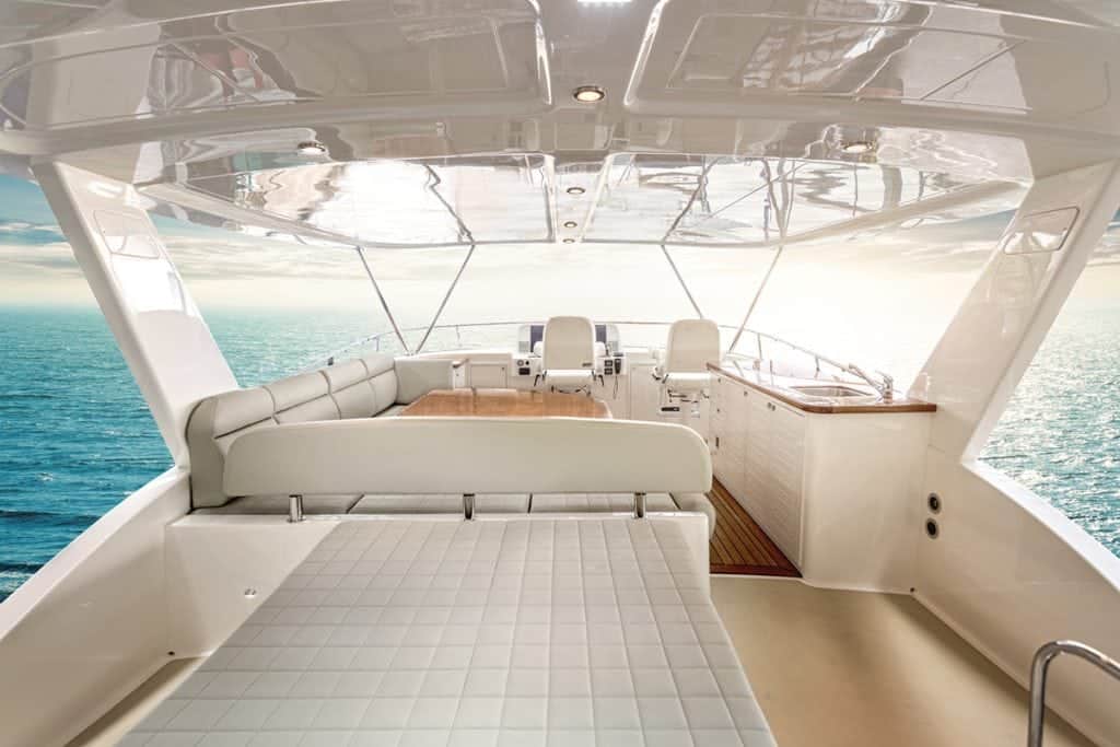 An L-shaped bench with a large table give guests a great view while the skipper and mate navigate from dual Stidd chairs forward of a wet bar on the starboard side. There’s plenty of room for storing a RIB with davit.As we headed out Port Everglades, the captain powered up the twin Volvo IPS 1200S 900-horsepower diesel engines and there was little to no bow rise. The boat was solid in and out of the swell with no excessive slapping. We enjoyed the quiet ride as the GB60 climbed to a top speed of 36 knots, then the captain throttled back to a cruising speed of 27 knots.