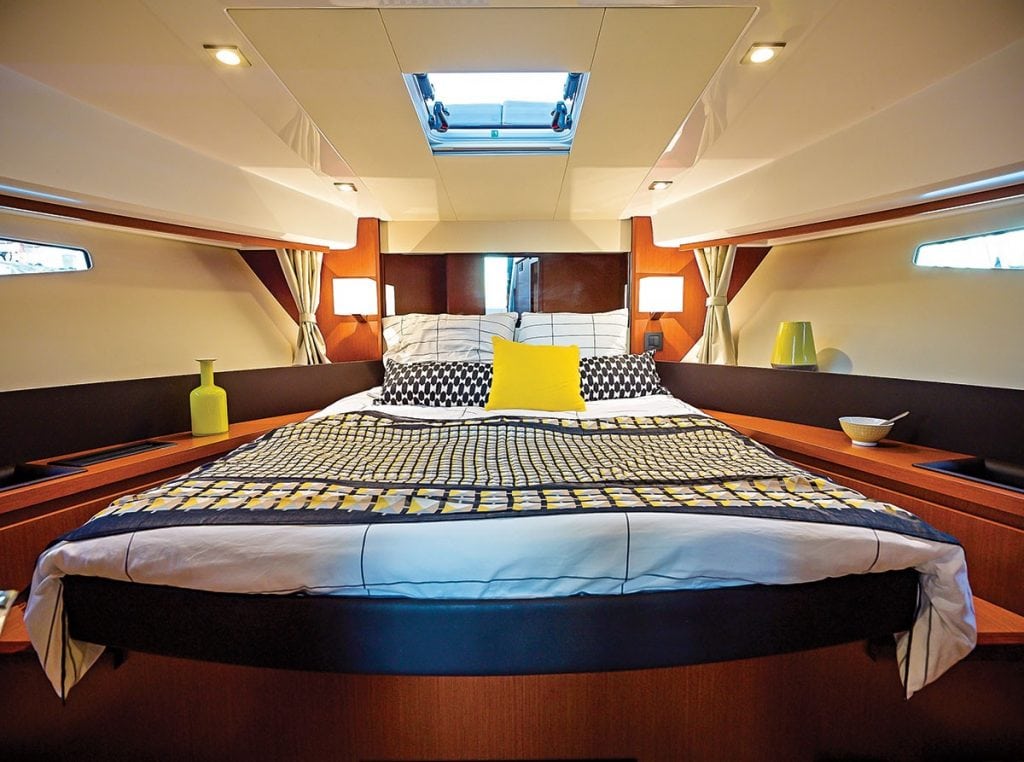 The Velasco 37F is most likely going to be operated by the owner, and Jeanneau’s design engineers have helped improve access to the bow from the main helm seat with a clever starboard-side door. With the flip of a handle the captain gains fast access to the starboard walkway to tend lines or handle fenders. It’s that kind of versatility that makes the Velasco 37F so interesting.