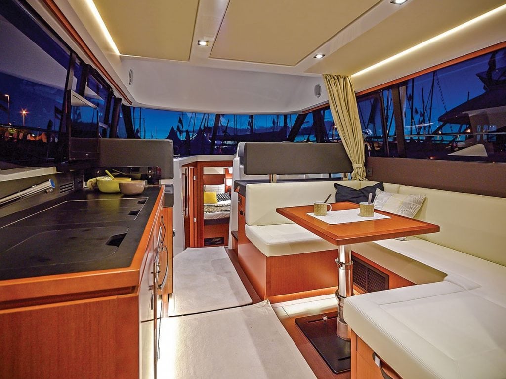 Flybridge boats practically demand to be driven from the upper helm station, and in warm weather climates that’s usually the captain’s favorite spot. But sometimes it can be too hot, cold, wet, or windy—and then piloting from down below in the comfy confines of the main helm station is the right choice. On the Jeanneau Velasco 37F you have all the latest power and navigation technology at the ready whether you are inside or outside and space for family and friends to enjoy the ride right along with you.