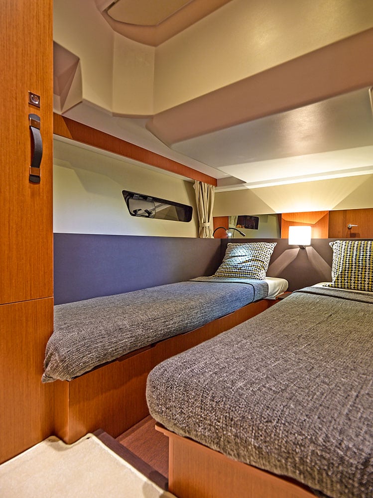 Stepping down two steps from the helm to the lower deck, the master stateroom is located forward and features a double bed and generous storage. A hanging locker to starboard and more stowage compartments under the bed allow for plenty of space for clothes and gear. A single head with toilet, sink and large shower enclosure is to port and shared with guests in the starboard-side guest stateroom furnished with two single beds, which can be joined with a filler cushion to make a larger two-person bed. Both staterooms have portholes to allow natural light in, and the master has a hatch in the ceiling for ventilation.