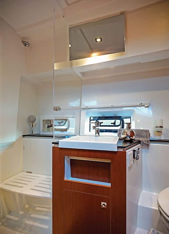 Entering the salon through a three-panel sliding glass door from the cockpit, the galley is to port with stove, fridge and microwave, and the U-shaped couch and aforementioned table is to starboard. The helm backrest is actually shared with the couch—another way that the boat’s social zones are tied together. To port is a copilot’s bench seat and map station, and what quickly becomes noticeable is the near 360-degree views throughout the salon. Huge port and starboard windows let in sunlight and also give the captain and guests a clear view of the surroundings. The forward windshield is wide and tall, while the aft salon sliding door provides excellent rear visibility.