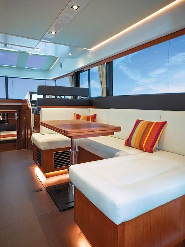 The flybridge is the highlight of the Velasco 43. This particular hull lacked some of the optional features, but it did have the all-important, greatly appreciated bimini for shade from the unrelenting Florida sun. The adjustable helm seat offers supreme comfort for the driver of the boat, and to port, a reversible bench seat is just as accommodating and even sports the added benefit of a footrest when facing forward. Facing backward, the bench seat becomes part of a U-shaped settee wrapping around a dinette table.