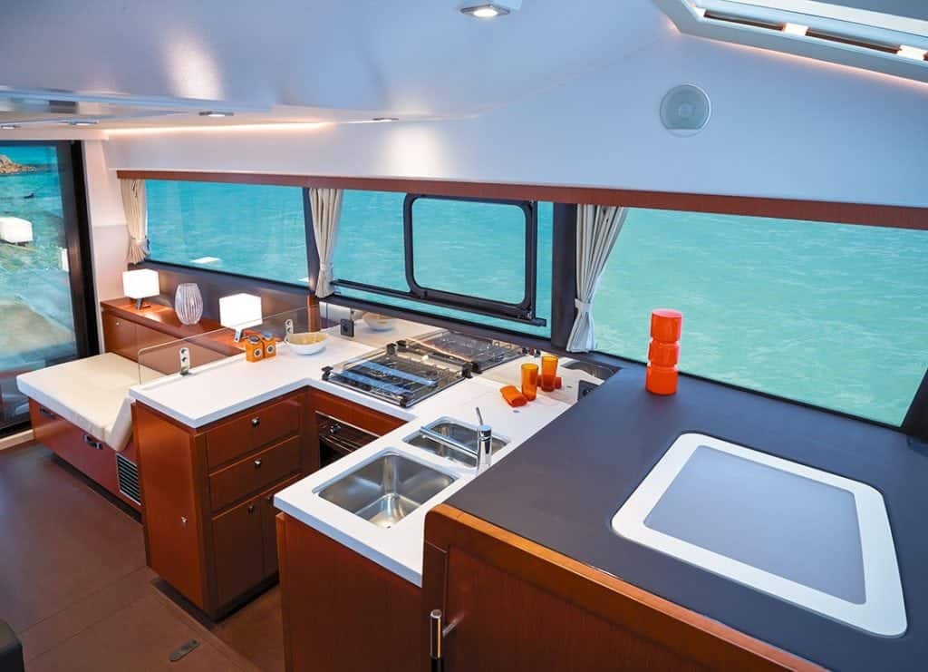 The salon is laid out nicely with the galley to port, just forward of a chaise lounge that adds a bit of European flair to the interior. It’s a feature we’re seeing more of as builders—especially those with Continental pedigrees such as Jeanneau and Beneteau—strive to introduce variety to vessel accommodations. It’s hard to lie down and relax on a U- or L-shaped settee with a dinette table in the middle, so introducing an amenity like a chaise lounge is a welcome design choice. You sacrifice some space in the galley, but overall, it’s worth it. And not to fear: directly across from the chaise lounge is a U-shaped settee for dining and entertaining.