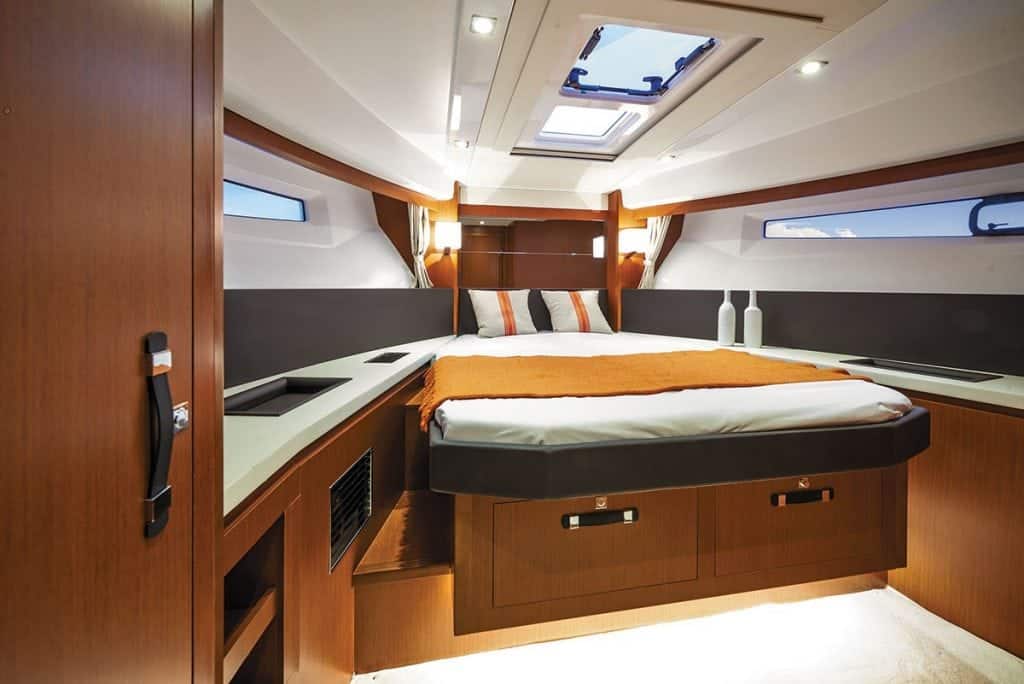 The aft deck area is roomy enough for lounging and casual socializing but could feel a bit cramped when the table from the saloon is added to the mix. While we’re on the topic of tight spaces, the asymmetrical side decks make some dance moves necessary as you progress forward to the bow. The starboard side deck is a fairly reasonable 15½ inches wide, but on the port side the passageway width narrows to 12½ inches. It shouldn’t be a problem for most people—just something to be aware of. However, Jeanneau ameliorates this compromise via several features, such as a sliding door on the starboard side that allows the helmsman to step out directly onto the side deck—a welcome advantage at the dock. Also, Jeanneau has substantially exceeded American Boat and Yacht Council (ABYC) safety standards with the height and thickness of the toe rails and handrails along the side decks and bow, so there’s very little chance of losing your footing in these areas.