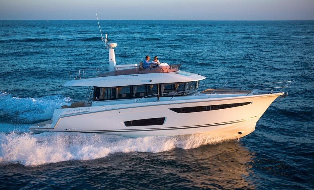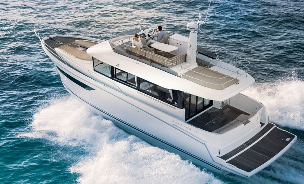 Not quite a trawler, not quite a sport yacht, Jeanneau’s new Velasco 43 occupies a niche in the market that will attract attention from a wide variety of boat buyers. And that’s saying nothing of its price tag, which at first glance would seem to be missing a figure. But more on that later.