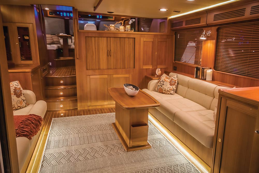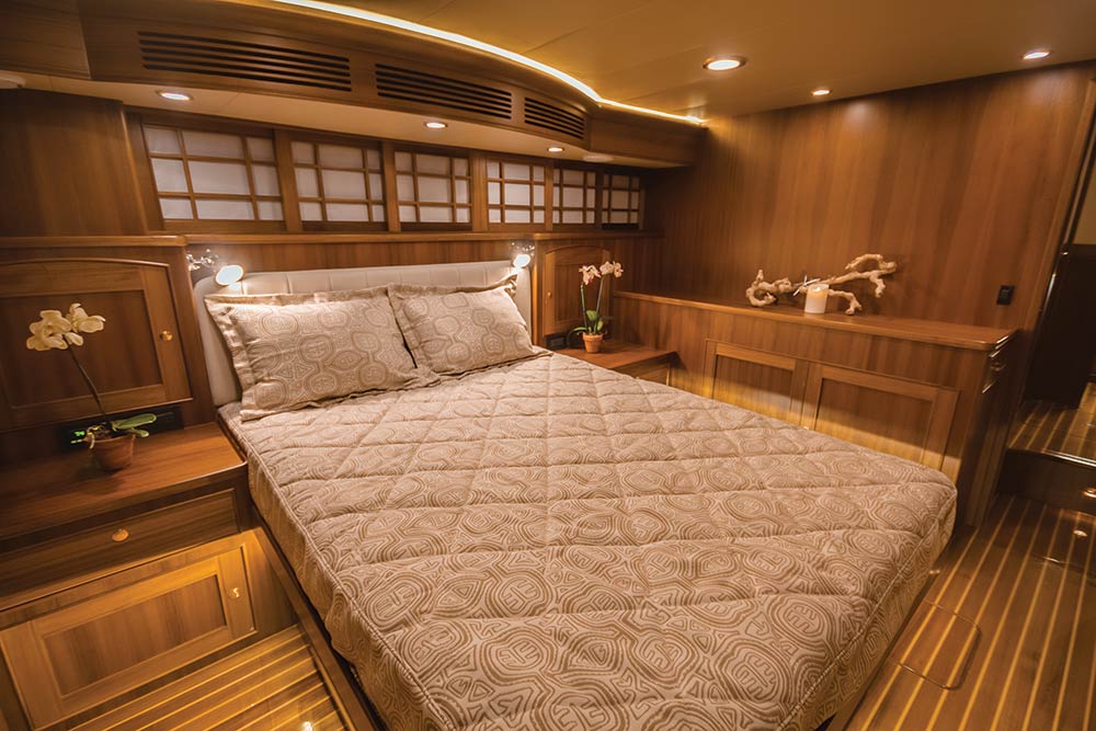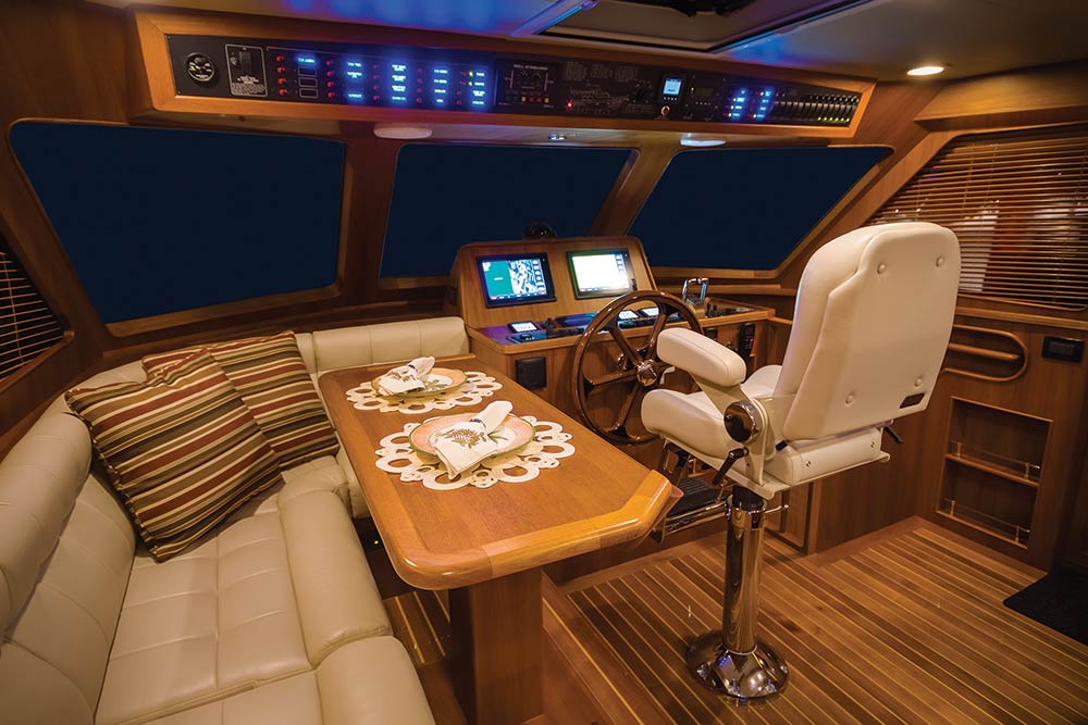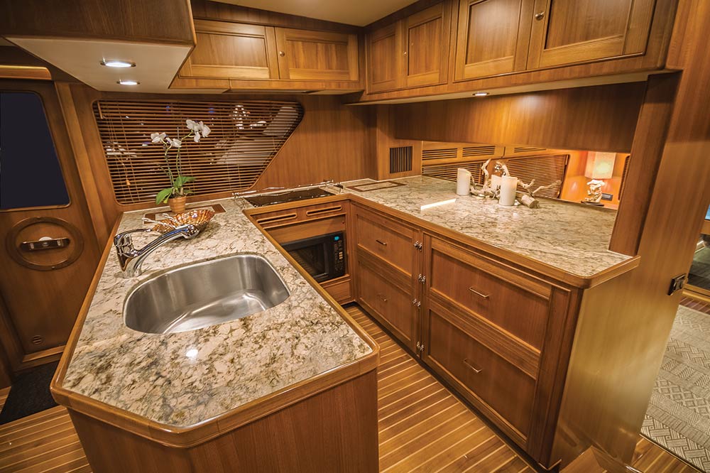 Attention to detail is evident in the little things such as those recessed interior handrails leading down to the staterooms; the distinctive overhead design found in the main salon; and the stainless steel engraved bell up on the bridge deck. It can also be seen in the thought given to the honeycombed and veneered granite tops for added weight saving as well as in the fuel fill stations located on both port and starboard sides with special catch basins for spill protection and readily accessible shut offs. It just reinforces the notion that if the right kind of attention is paid to a lot of little things, they add up to big ones. As far as her engine room goes, well, I’m a hands-on kind of guy and I found all the critical maintenance areas, including pumps, switches, equipment spaces, sea chest—and any other place I would need to access—to be free and clear, thus eliminating any knuckle-busting, elbow-slamming, head-jamming situations.