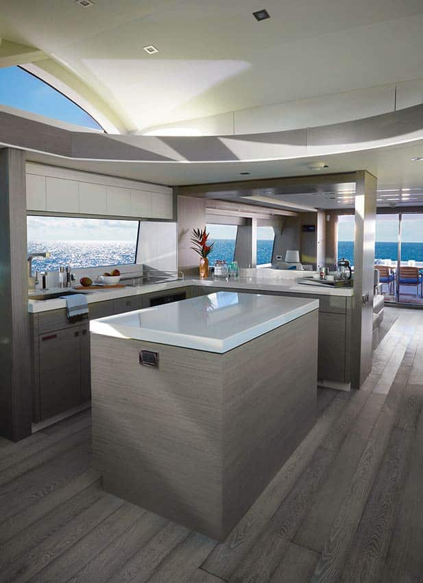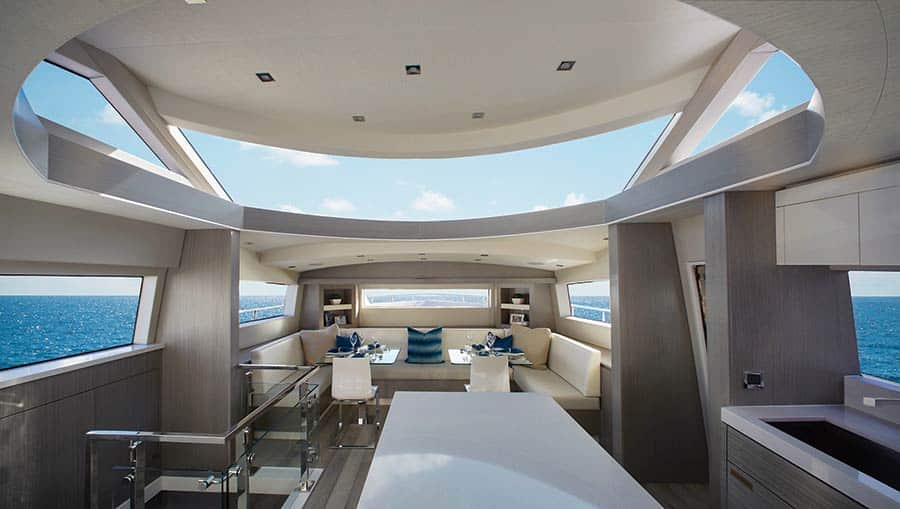 A pantograph door on the starboard side by the galley opens to the wide, protected side decks and to the bow, where another social area with three large sunpads is nestled up in front of the window above the dinette. Additional bench seating, port and starboard, can hold even more guests.