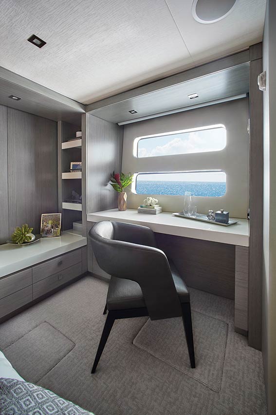 Living aboard is easy. The yacht has four staterooms, including a full-beam midships master worthy of a five-star hotel, two staterooms forward and a private VIP in the bow. Then there’s the crew’s cabin below, with its own head and work area. (The 70 is designed to be run by the owner or by crew.) A dayhead is on the main deck opposite the galley.