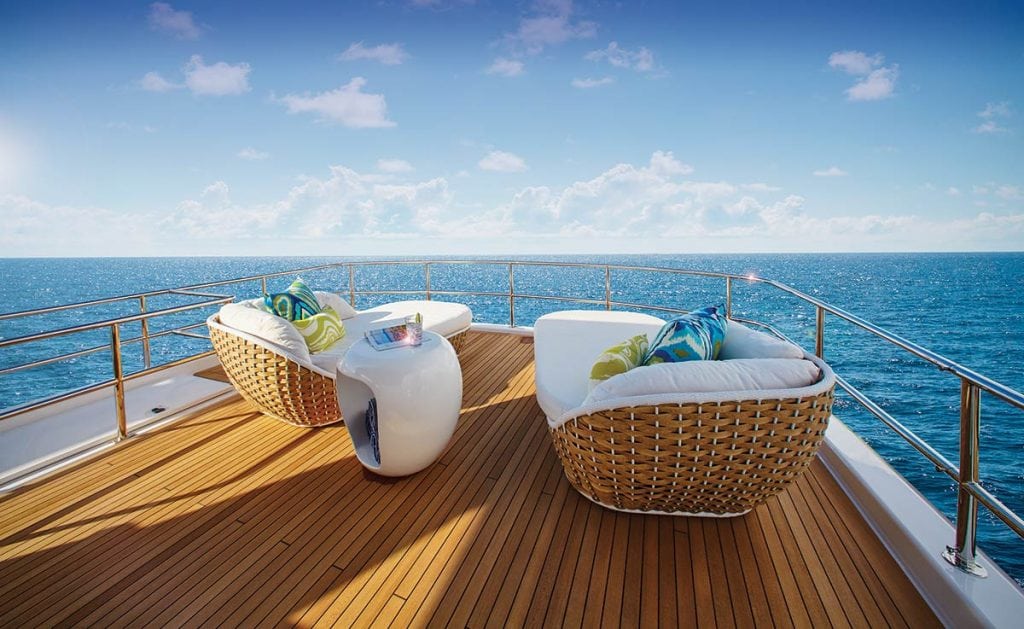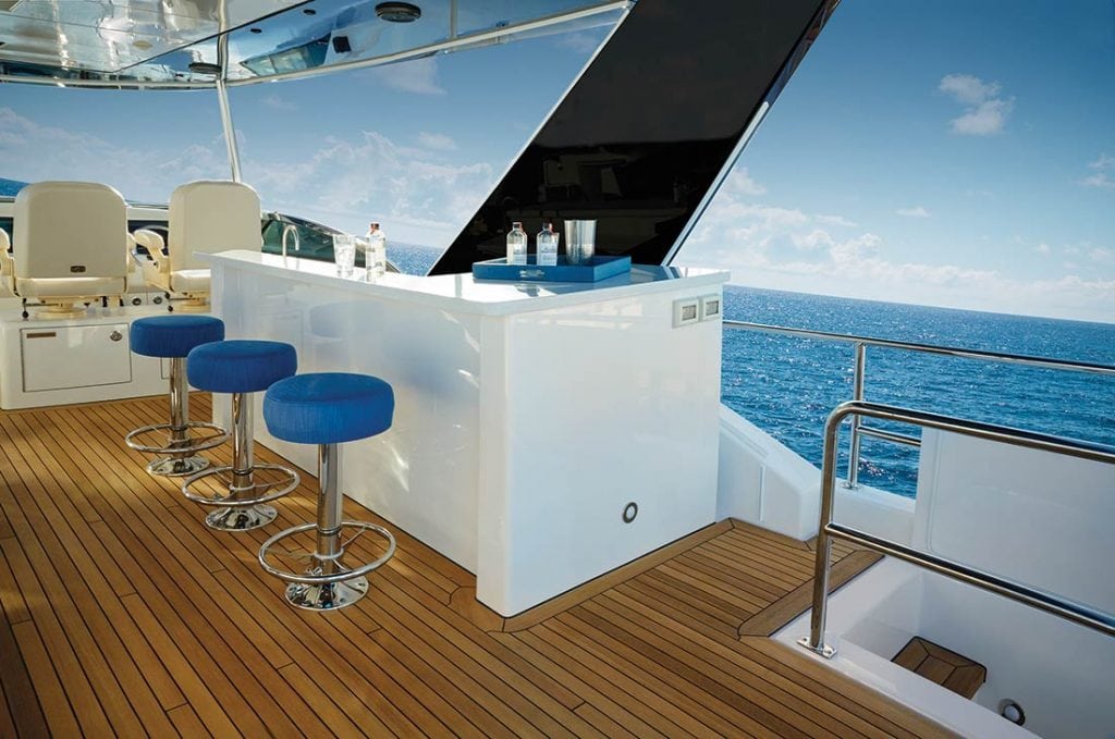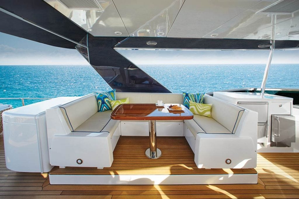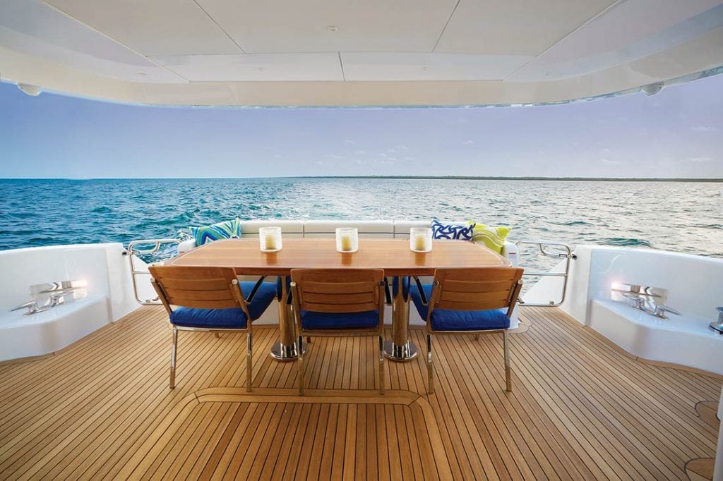 Step aboard the 70 from a wide and deep swim platform and go up five molded fiberglass steps to the aft deck protected by the extended boat deck above. (Or board the yacht from gates on each side if the 70 is tied up at a high dock.) The aft deck can be enclosed, but the evening I was there it was open with a warm breeze simply begging guests to sit down at the high-gloss teak table and enjoy a glass of wine or appetizer. The table is mounted on two stainless steel pedestals, while a molded bench seat along the transom and three chairs forward can sit six or more guests comfortably. A bar with sink and fridge completes the entertaining motif here.