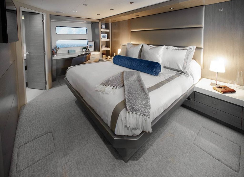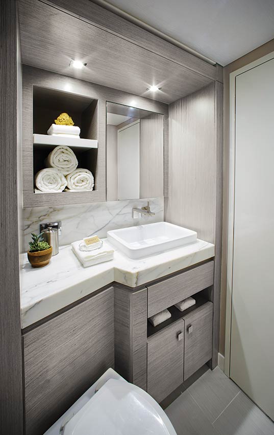 Reach the accommodation deck below from curved stairs on the port side opposite the galley, where there’s enough extra space for half a dozen of your best friends to sleep over—if you so desired—then enter the luxurious master stateroom turning aft. Cedar-lined storage is under the king-sized bed as well as in the walk-in closet. With an all-white countertop and two sinks, the master head is light, contemporary and upscale. An all-glass door opens to the shower, which features a marble bench seat.