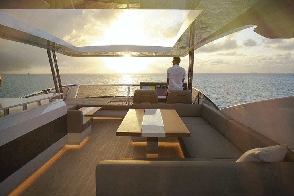 “We really study how people use their boats,” he says. It’s why he chose not to eat up the salon space with a formal dining table and instead, offers plenty of other options such as the top deck, the aft deck, the galley bar, and the dining nook next to the helm, which, he points out, can be specified as a fixed table with six chairs. “But most people prefer to eat outside,” he says.