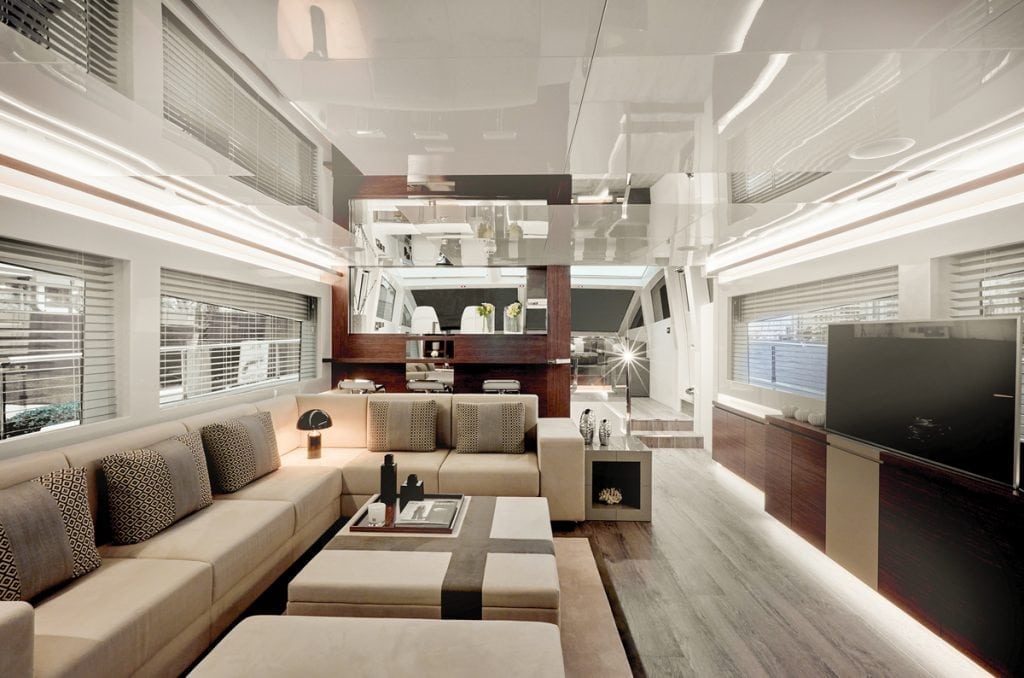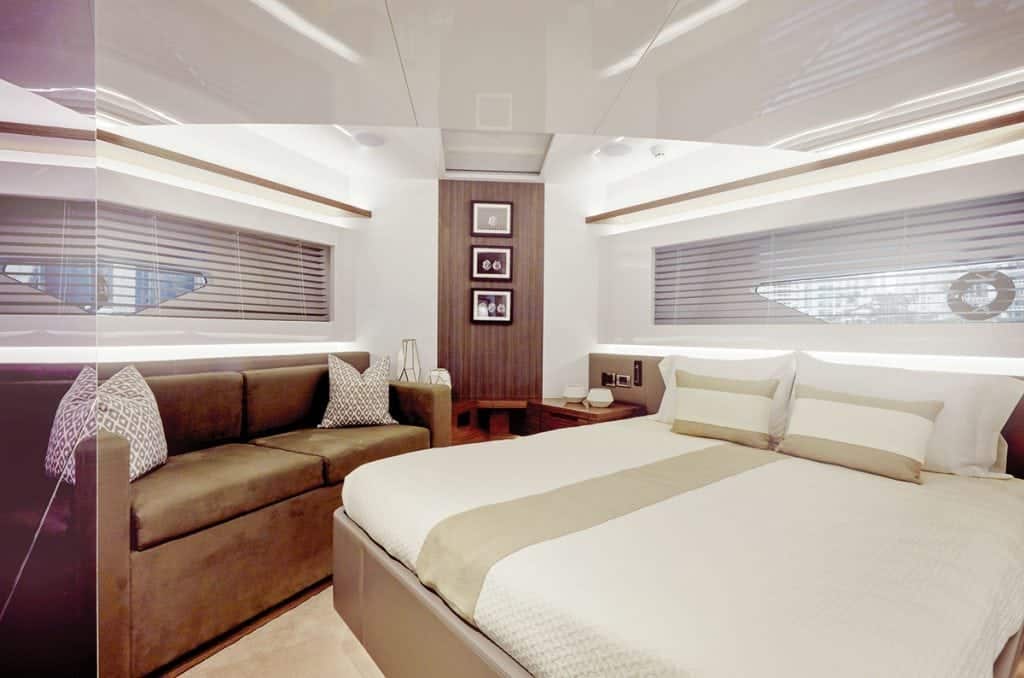 The result is an extra-roomy salon made all the more vast with the open plan design that looks through the port-side galley all the way to the helm windows forward. The salon is also quite striking, which isn’t surprising considering the source. The décor is by celebrity designer Kelly Hoppen MBE, Britain’s equivalent of an HGTV star and a Member of the Order of the British Empire, an honor bestowed by the queen. Her signature design philosophy, which relies on neutral tones, clean lines, and opulent textures, translates well to the light, bright interior of the Pearl 80.