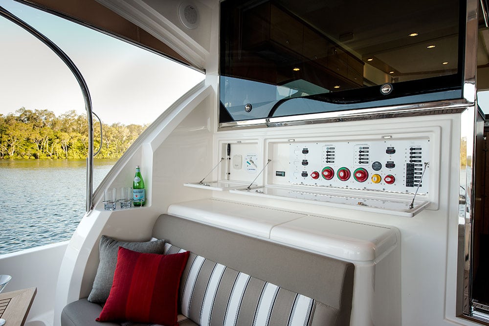 But Riviera’s management team did not follow the usual pattern. They chose, instead, to tough it out and effectively manage the company back to financial health. Such an approach puts a massive strain on management, creditors, dealers, suppliers, and employees—in most cases, the bankrupt company can barely function, but that’s not what happened at Riviera. In fact, the builder not only continued to build—albeit at a reduced level—it developed new models and added new features to existing models. The end result is an encouraging recovery story and led to one of the newest Riviera offerings, the 50 Enclosed Flybridge.