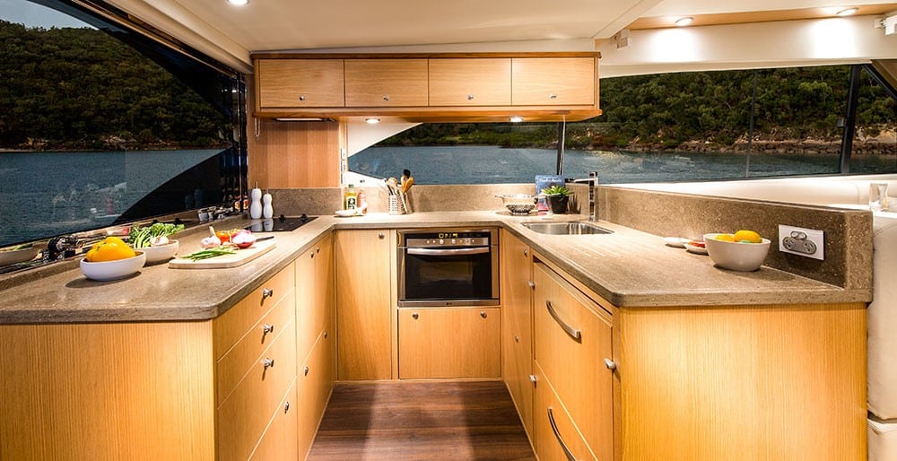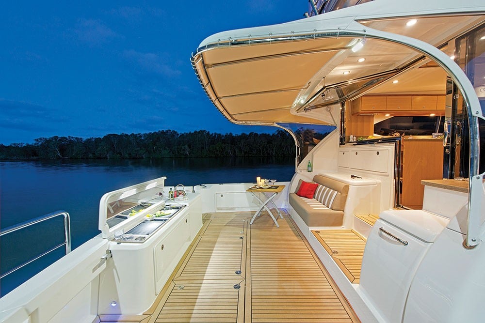 The galley’s easy access to the aft deck will allow the cook or caterers to easily prepare meals for more than a dozen people—especially when combined with the aft deck barbeque center. This area of the boat is also well protected from rain or blazing sun by the extended saloon roof.