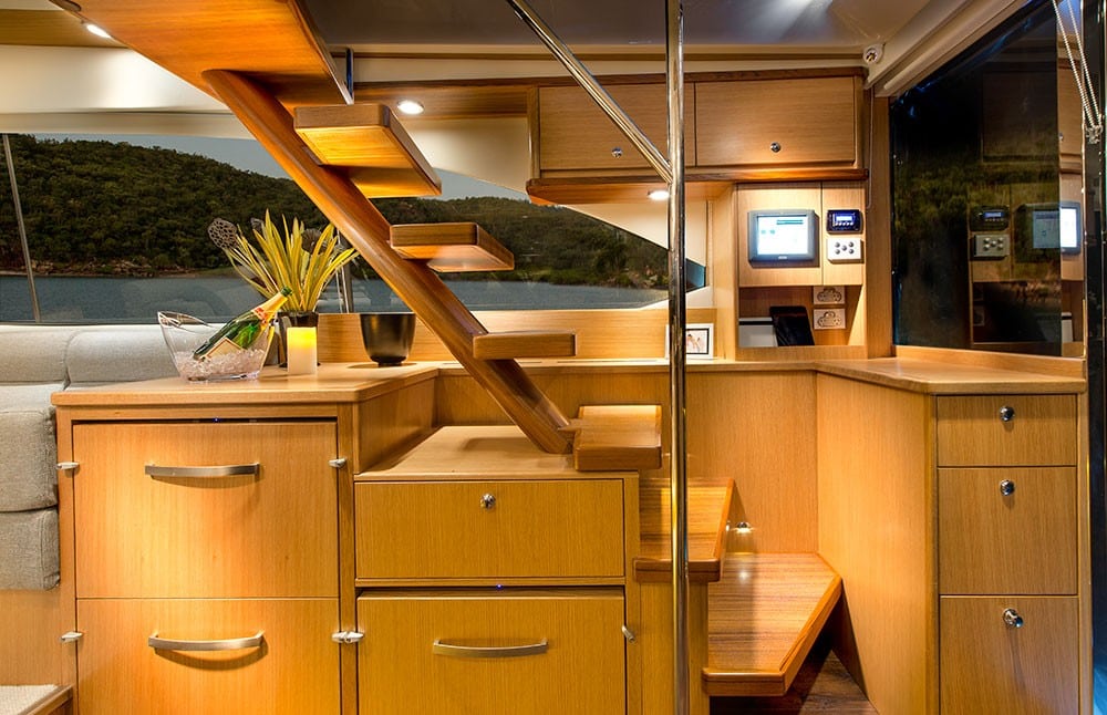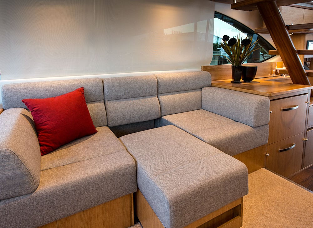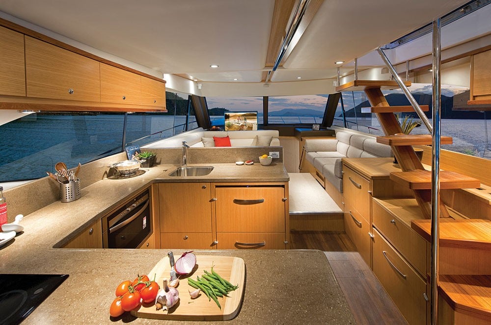 Riviera designers have put together an open-plan saloon to take advantage of the fact that there is no inside helm station. The interior is bright and cheery, and will remain so even on a dull day due to the substantial amount of window glass. Windowsill heights are low enough that anyone sitting at the U-shaped dining settee and table, or on the lounge across from it, can comfortably see outside without stretching or getting up.