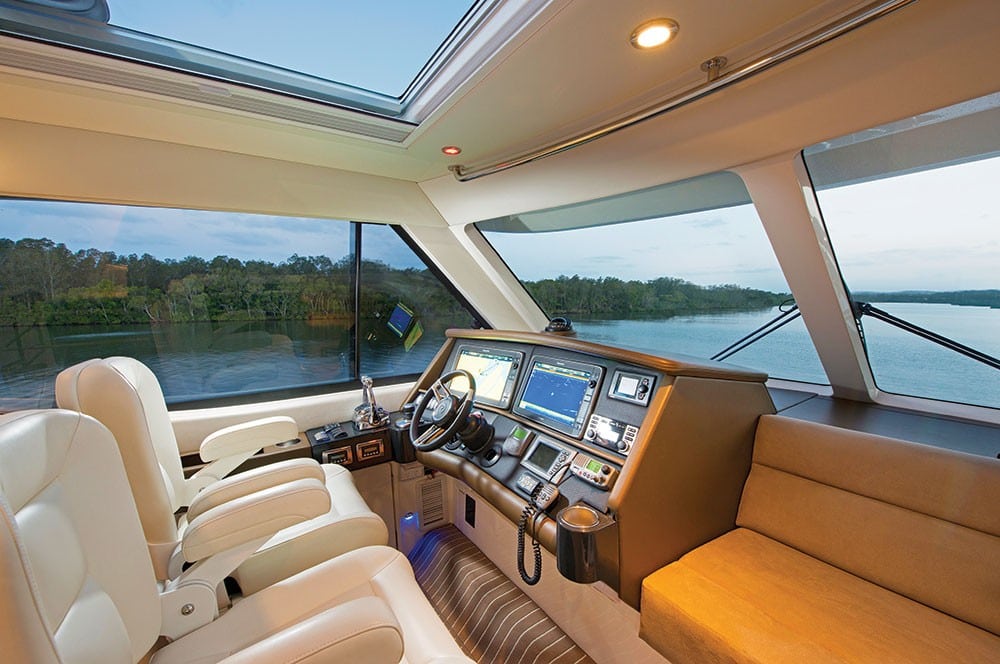 Visibility while cruising is unparalleled. The fit and finish throughout the vessel is excellent, and all equipment and appliances are first class. The pod-drive system, combined with joystick controls, will make anyone a great boat handler.
