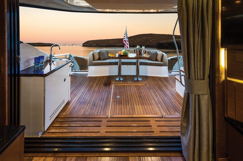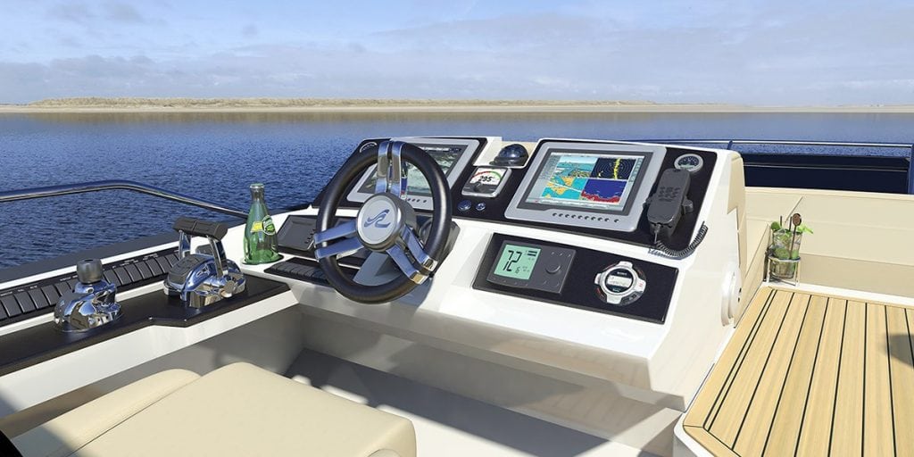 The L650 Fly is powered by twin Caterpillar C18A 1,150-hp diesel engines. A lower helm station on the main deck and a flybridge helm station both feature—in addition to standard helm equipment—two large Raymarine multi-function displays that offer a plethora of configurations to display engine performance and other ship data.
