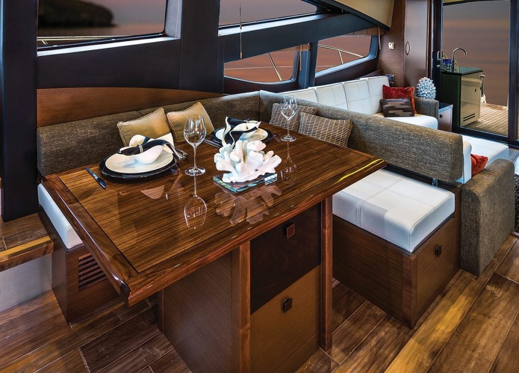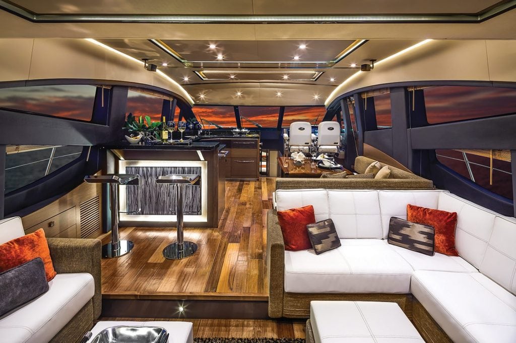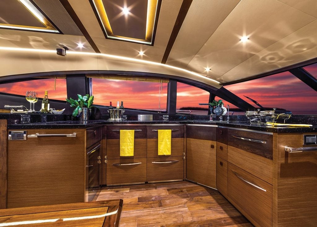 The cockpit offers an expansive social zone that features transom seating, a teak table, refrigerator, and plenty of storage. A four-panel sliding door opens up to the salon, and Sea Ray’s design team led by Tom Bucaccio created an open flow from the cockpit all the way through the salon to the helm station to starboard and galley to port. “One of the design elements of this boat is to integrate the salon and cockpit together,” Walker said. “There is a seamless transition without a high threshold for the salon door panels. A drainage trough is located in the cockpit sole to drain water overboard. The salon door panels stack to port creating a large opening.” The salon and the entire interior features walnut joinery and peppercorn inlays in areas such as the doors for a pleasant combination of textures. Leather pulls on cabinets and closets create a feeling of luxury yet are entirely useful. The salon layout starts with facing settees to port and starboard as you enter, with a two-seat bar to port amidships and a dining table and L-shaped settee to starboard. The fully stocked galley is to port opposite the lower helm station and features a sink, dual refrigerators/freezer, a wine cooler, and a unique pop-up storage area for your Sea Ray logo’d china. Natural light pours in from the large side windows.
