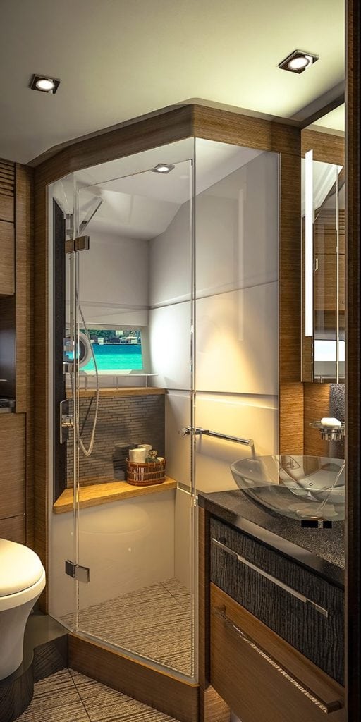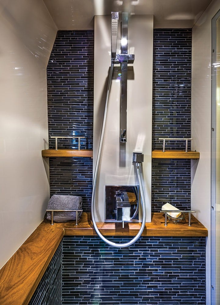 Staterooms to port and starboard each feature twin berths and share a dayhead—side windows connect guests to the sea and again, allow in plenty of light. The full-beam queen master is located midship aft of the companionway. A large head offers dual sinks and a large rain-head type shower with more than 6 feet, 6 inches of headroom. Mosaic tiles decorate all the heads and extend into the showers.