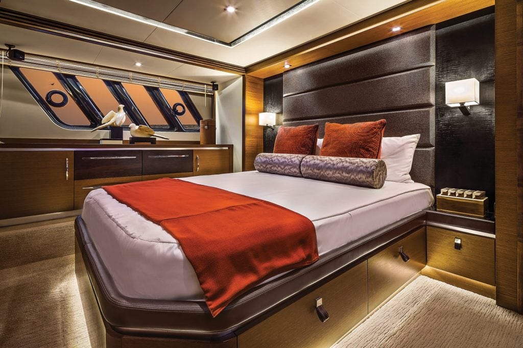 The L650 Fly’s lower deck is accessed from the salon deck by a seven-step staircase and aided by a leather-wrapped handrail, and the landing area is bright due to atrium windows that let in the sun. Previous Sea Ray models were somewhat enclosed in this area, and the design team wanted to break from that with the L650 Fly. The lower deck features four staterooms and three heads. There is also a standard day head accessed from the swim platform for a total of four standard heads. The VIP stateroom in the bow offers a queen berth with private head, and LED rope lighting—a skylight and large hull windows create an airy feel.