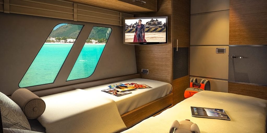 While at rest, twin Seakeeper gyrostabilizers to port and starboard in the engine room take the roll out to make guests more comfortable. In fact, everything about the L650 Fly has been designed to enhance comfort for passengers. For example, a hydraulic swim platform lowers nearly two feet into the water to make reboarding easy after a swim or launching a tender. The cockpit is accessed via either port or starboard stairs from the swim platform, and an optional passerelle can be added to the port side. So if the passerelle is extended, you still have access to the cockpit from the starboard stairs.
