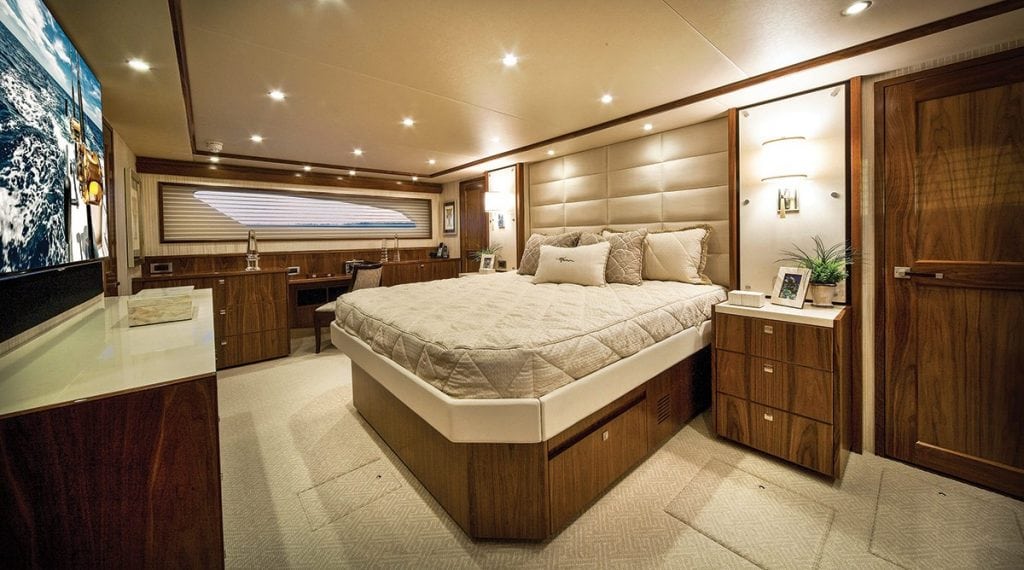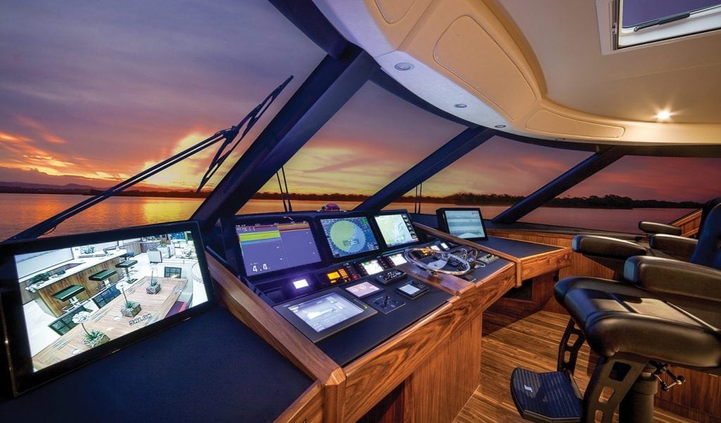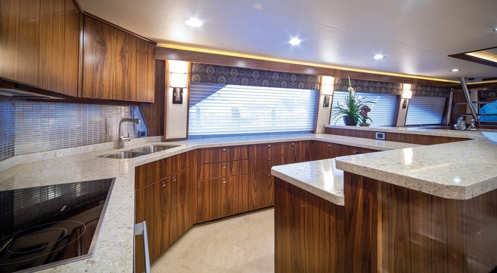 “We’re 200,000+ pounds with full fuel and water,” explains Higgins in the noticeable quiet of the enclosed bridge. “But that all goes to our design and engineering teams with our resin-infused hull and deckhouse reinforced with carbon fiber, Nomex honeycomb in many of the interior panels for weight saving, and along with the hull bottom featuring flush and recessed engine pickups. To help further eliminate drag reduction, we eliminated the keel resulting in a straight V.”