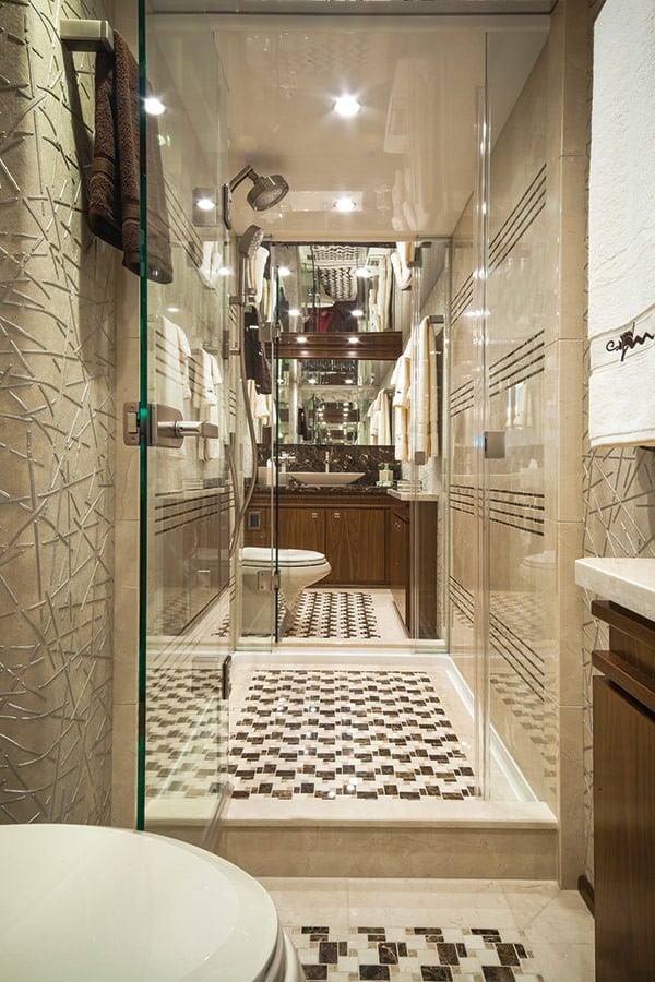 For example, the pantry on the main deck’s starboard side can be converted into another stateroom. Indeed, on Hull #2, the owner is eliminating the free-standing dining table and reworking the salon layout along with the his-and-her heads by making one side a walk-in closet with the other a special locker design. The owner of Hull #3 included a dinette area inside.