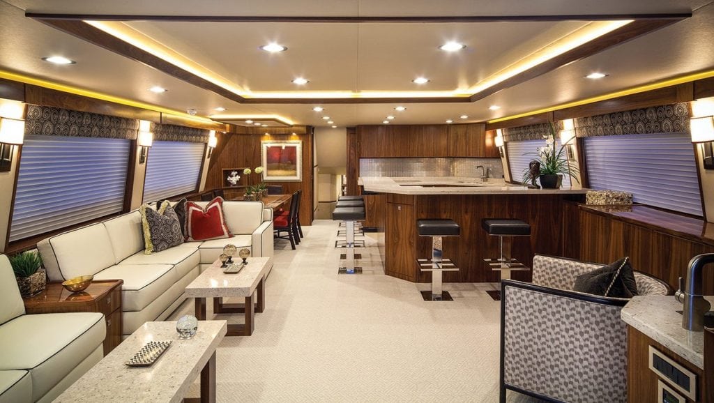 To say the least, the interior fit and finish along with the décor package is as tastefully and well done as I’ve seen on any vessel of her class—and then some. The team paid special attention to the aft deck for an outdoor dining area. The variation on the theme incorporated the mezzanine area and created two levels—a yacht aft deck and a separate fishing mezzanine with seating, livewell, and refrigeration for the massive business end of the 92 EB, the lower cockpit. Fishing crews will utilize this space to be serious competitors in any tournament event.