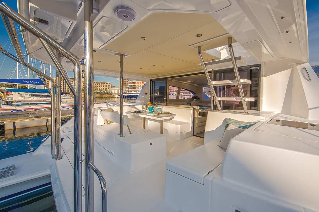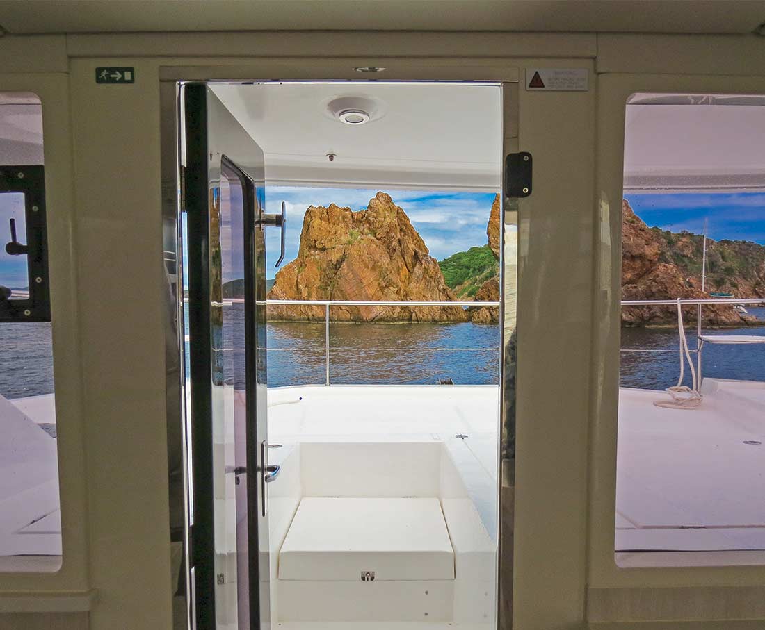 The next morning, Rubis schooled us on her many on-deck benefits. Her bow was wide and the hard deck (no trampoline) spanned her entire beam. Picking up a mooring was easy; I could move quickly from side-to-side and brace my hips on the stainless steel railing. I then reached down to work the lines on the cleats with both hands. Once done on the foredeck, I stepped through the full-sized forward door into the salon starting what was going to be our normal traffic pattern around the boat. While open, the door blasted air through the interior and cooled it down much faster than any port or hatch ever could.