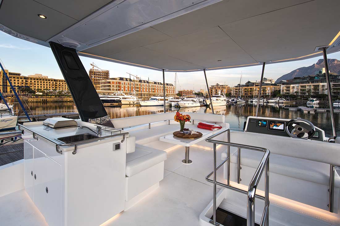 Catamarans offer extensive exterior spaces, and people congregate mostly in the cockpit. But the flybridge became our favorite spot when driving, sunning, dining, or watching sunsets. Here, a galley module had a Kenyon electric grill and sink. An option on the Leopard 43 is to add a refrigerator or an icemaker, so the party never has to leave the flybridge. All the way forward was a double sunpad suspended over the forward cockpit. With a railing all around, it was a comfortable and safe place to lounge even when under way.