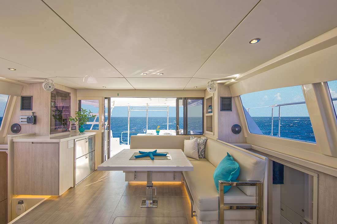 This 43-foot catamaran felt more like a 52-foot monohull. To maximize the spacious feel, Leopard has flipped the salon layout, with the dinette facing forward and up against the cockpit settee. Open the door and windows between the two to create one large living room. The L-shaped galley in the starboard corner faces forward, and I liked looking ahead when cooking under way. To port was a small navigation desk that we used primarily to store cruising guides. It was also the place for charging phones and cameras since there were four USB ports on the bulkhead.
