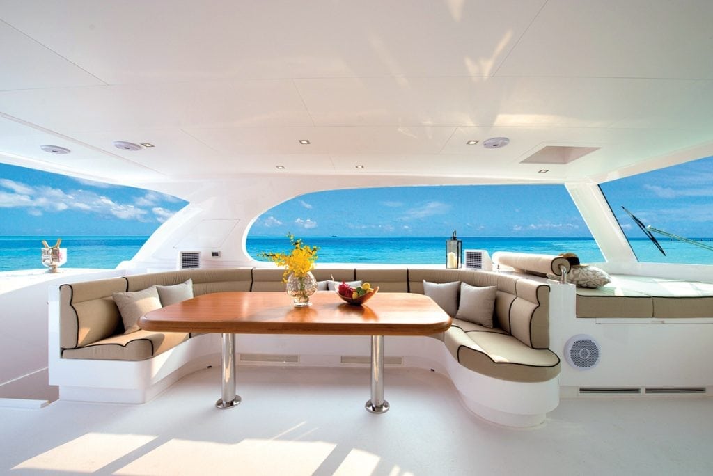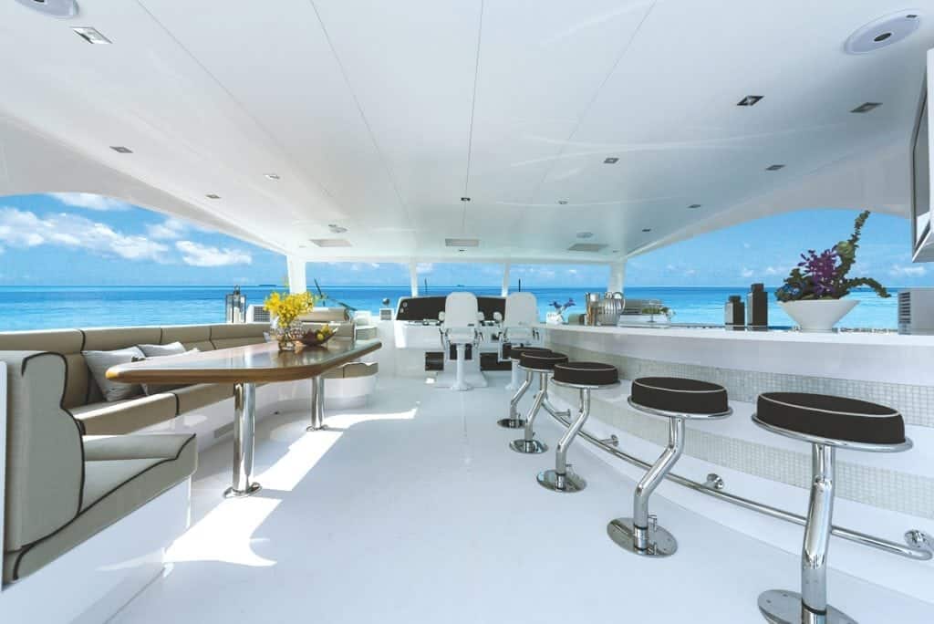alfresco dining for 10, a large sofa, bar area with fridge, icemaker, and TV. Storage is abundant, including room for 12 dive tanks. Guests can step down to the swim platform