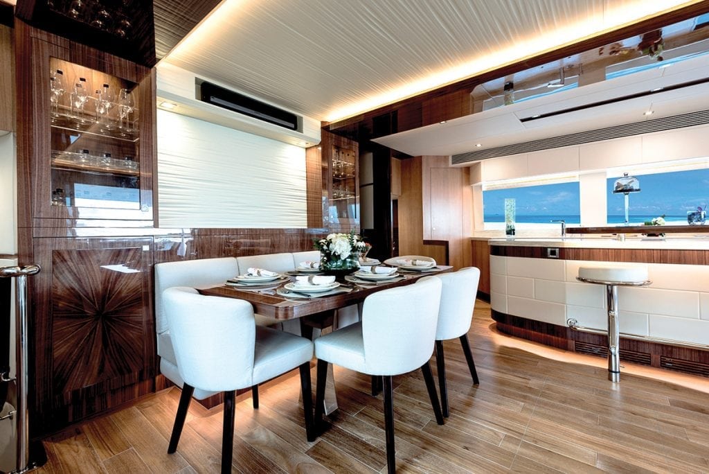 The walk-through galley tucks under the windows on the starboard side with walnut cabinet doors. Discretely nestled in the corner is refrigerator/freezer is with matching walnut coverings. A freestanding bar with stools gives more counter space and is the perfect spot to chat with the chef or pitch in during meal preparation. White Corian countertops add to the room’s clean look. When dinner’s ready, a formal dining table seats eight and completes the layout’s feng shui balance and simplicity.