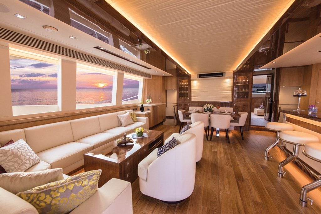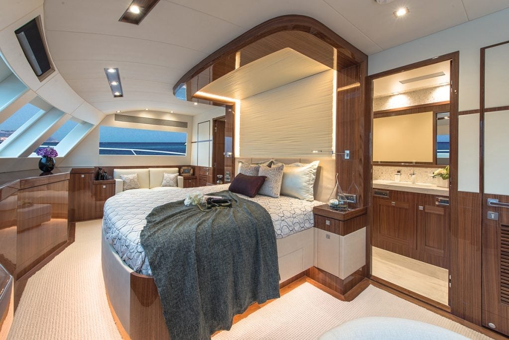 Forward of the salon, owners or primary charter guests walk into the full-beam master suite with a walkaround king bed, vanity, double sofa, high-gloss cabinetry with high-gloss walnut elm burl counters, custom craved-leather inlay accents, and large windows offering a 180-degree view—a room with a view that changes with the yacht’s every move.