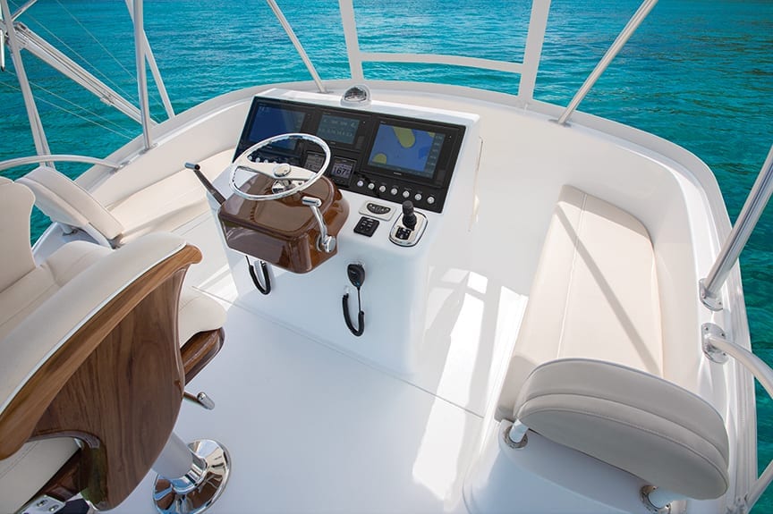 The fiberglass helm pod painted to mimic teak adds a custom touch and is augmented with single lever controls with thruster buttons and power-assisted hydraulic steering.