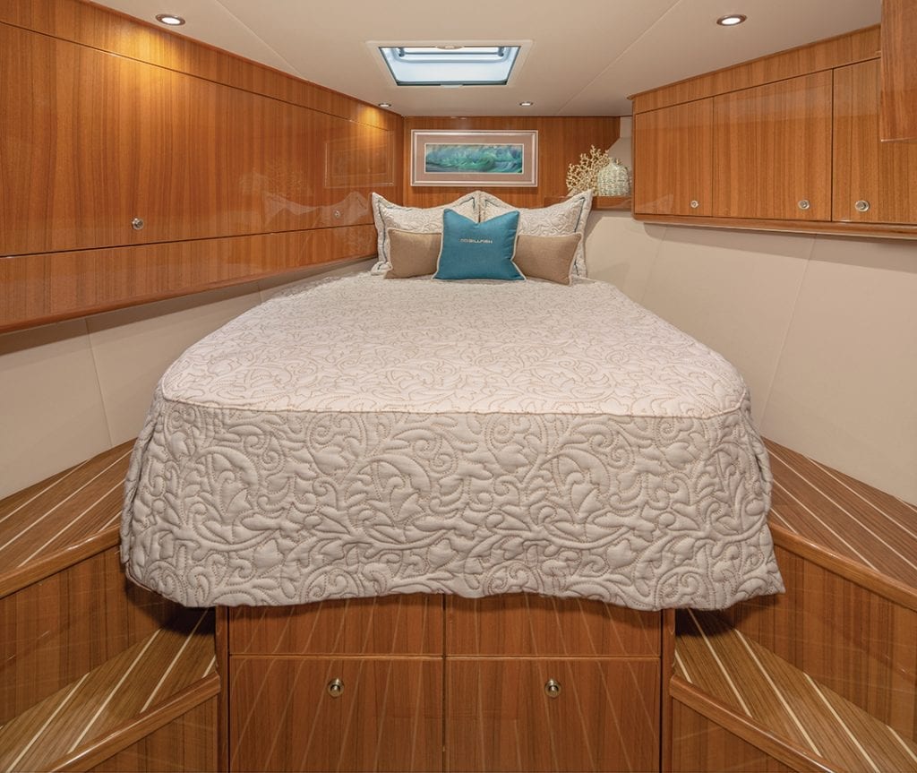Electrically actuated rams lift the sole to expose each engine compartment, but a center hatch also provides access for quick daily checks. Viking’s attention to detail in the mechanical space is outstanding. The bright white Awlgrip-painted bilge lights up the area, and the slender, inline six-cylinder Cummins engines are accessible for routine maintenance and service. Racor fuel/water separators, seacocks, sea valves, and strainers are labeled and painted with white Awlgrip. Wire and plumbing runs are neat and chafe-protected.